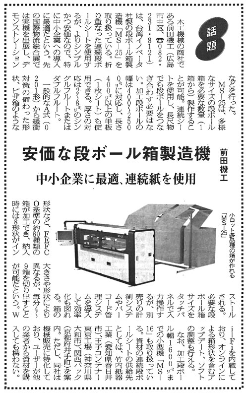 弊社ダンボール製造機が日報ビジネス(株)「週刊 包装タイムス」2021年4月12日号に掲載されました。