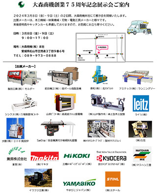 記念展示会では、木工機械・林業機械・刃物・電動工具などの様々なメーカーが出展いたします。